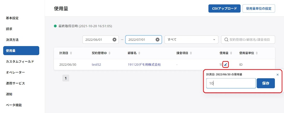 内容:使用量アップロード後、管理画面から使用量の修正・更新ができるようになりました