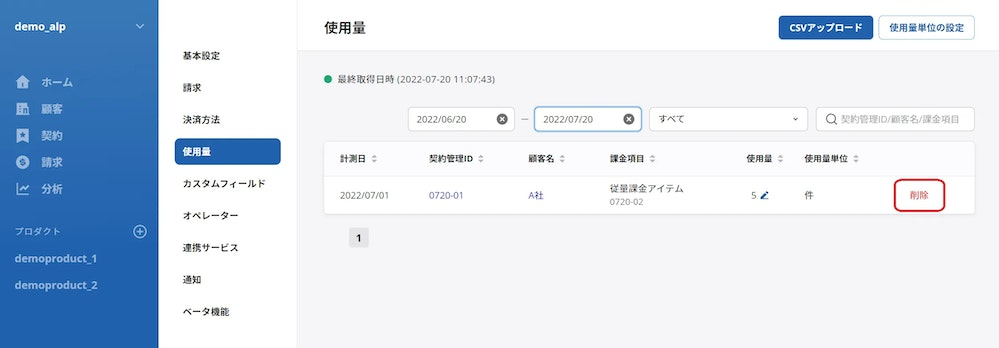 内容:使用量アップロード後、管理画面から使用量の削除ができるようになりました